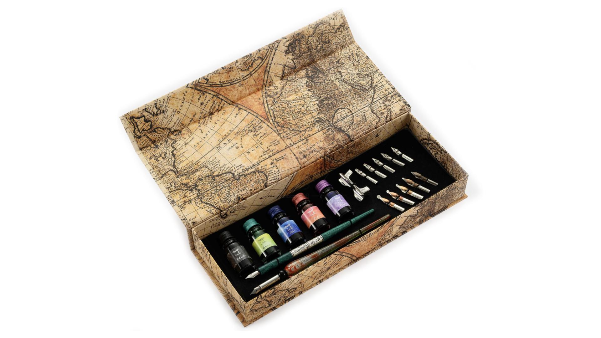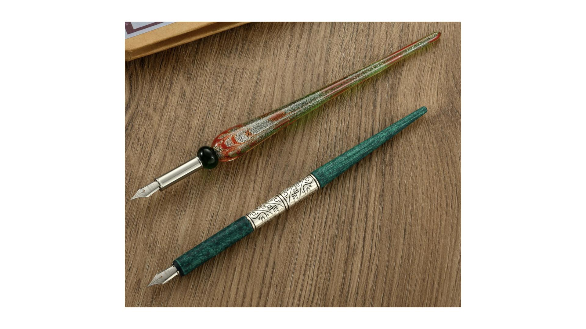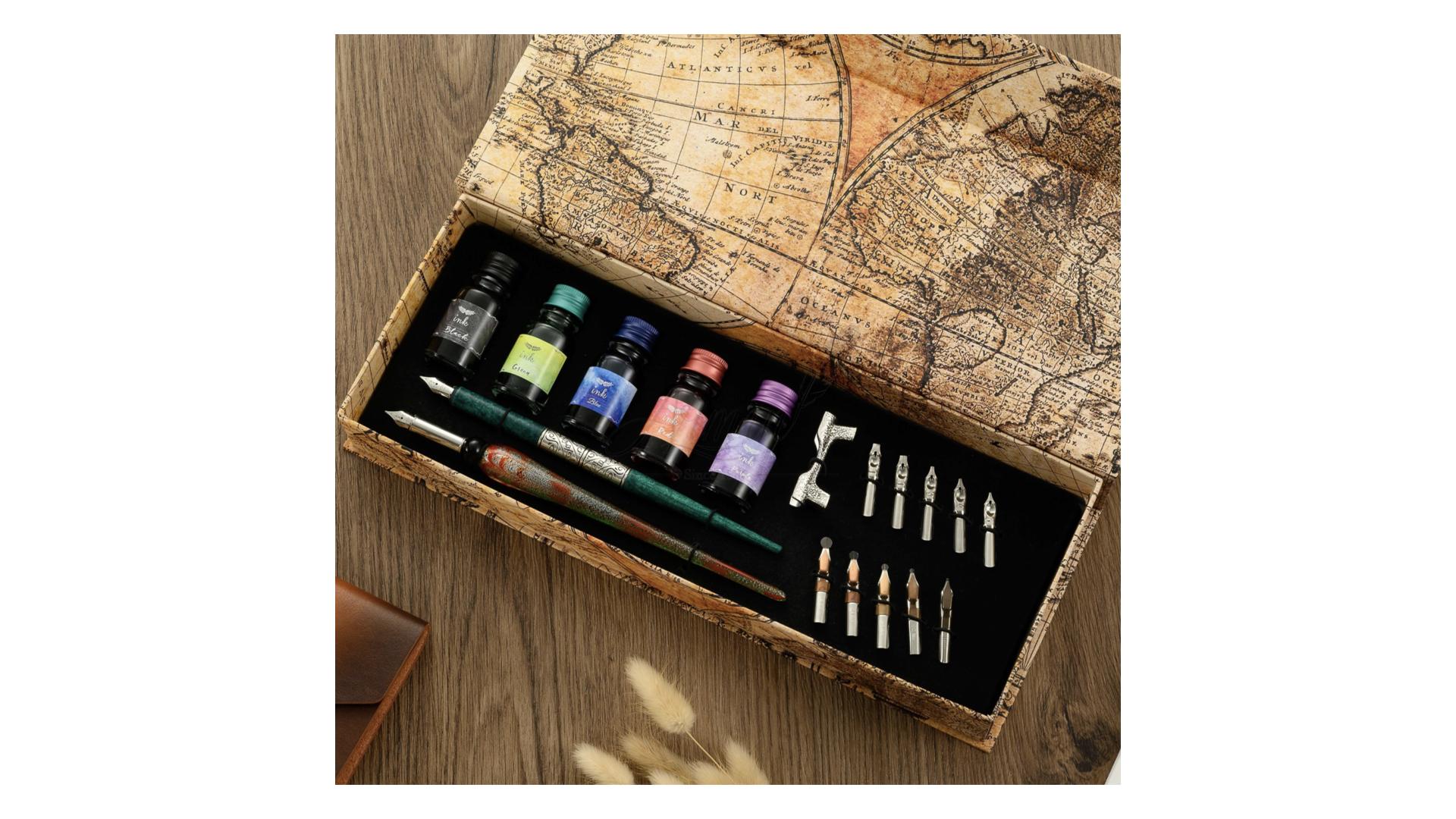 ست: قلم دسته چوبی، قلم دسته شیشه ای، پایه نگهدارنده قلم، ۱۰عدد نوک فلزی و ۵عدد جوهر شیشه‌ای
